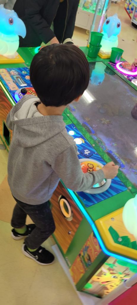 二人ともたまった宿題やチャレンジタッチを終わらせたのでご褒美に久しぶりにコインゲームをしに行きました。